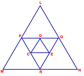 2. Three triangles, △LMN, △PQR and △CDE are formed in such a way that the inside triangle is formed by joining the midpoints of the sides of outside triangle. △LMN is the outermost triangle while △CDE is the innermost triangle. The length of the sides of inner most triangle are CD = 3, DE = 8 and CE = 4. Find the perimeter of the outermost triangle.