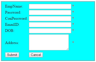 <td>EmpName:</td><td> <asp:textbox id="txt1" runat="server" ></asp:textbox></td><td><font color="#cc0000">*</font></td>