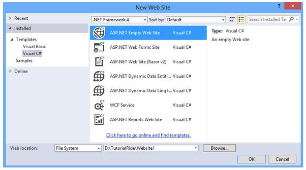 Start Visual Web Developer and select File, New Web Site. The New Web Site dialog box appears as given below. Provide the location and name of your website. If you don’t want inbuilt master pages along with other web pages then choose ASP.NET empty web site otherwise choose ASP.NET forms web site. We have chosen ASP.NET empty web site.