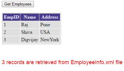 Label1.Text = ds.Tables[0].Rows.Count.ToString() + " records are retrieved from EmployeeInfo.xml file";