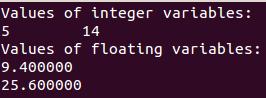 float c=9.4, d=25.6; // declaration of variables (floating types variables)