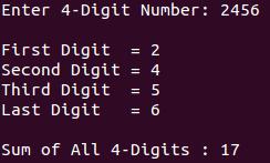 printf("\nFirst Digit = %d \nSecond Digit = %d \nThird Digit = %d\nLast Digit = %d\n",f,s,t,l);