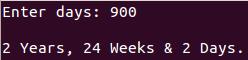 printf("\n%d Years, %d Weeks & %d Days.",yrs,weeks,days);