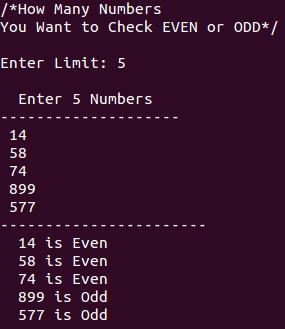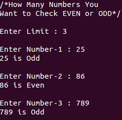 printf("/*How Many Numbers \nYou Want to Check EVEN or ODD*/\n\nEnter Limit: ");