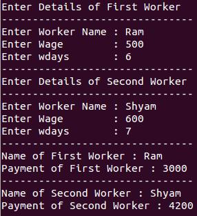 printf("Name of First Worker : %s\nPayment of First Worker : %d\n",a.name,p1);