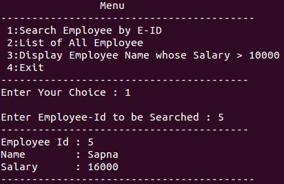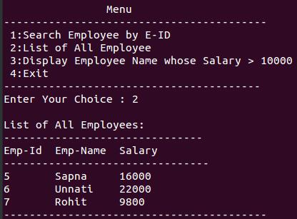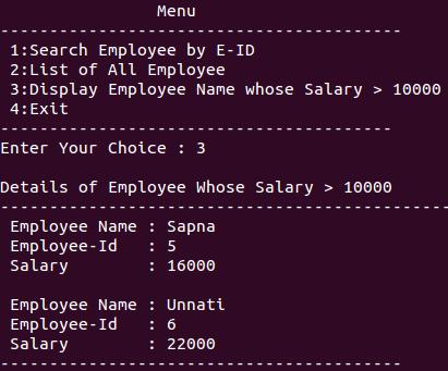 printf("\n 3:Display Employee Name whose Salary > 10000 ");