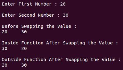 cout<<"\n Outside Function After Swapping the Value : \n"<<" "<<num1<<"\t"<<num2<<"\n";
