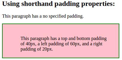 <p class="padding">This paragraph has a top and bottom padding of 40px, a left padding of 60px, and a right padding of 20px.</p>