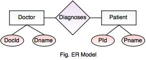- Ellipse represents the attributes. Eg. DocId, Dname, PId, Pname. Attribute describes each entity becomes a major part of the data stored in the database.