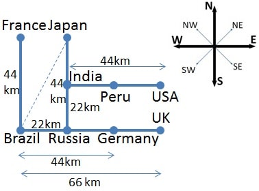 19. USA is 44 km to the east of India. Russia is 22 km to the south of India and Japan is 44 km north of Russia. Brazil is 22 km West of Russia. France is 44km north of Brazil. UK and Germany are 66km and 44km towards east respectively from Brazil. Peru lies between India and USA. What is distance between Japan and Brazil?