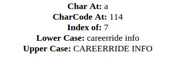 document.write("<b>CharCode At:</b> " + str.charCodeAt(2)+"<br>");