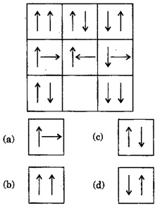Take first row. From 1st to 2nd figure, right side arrow inverts. From 2nd to 3rd figure, both arrow invert.