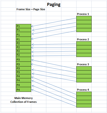 In paging, a process is divided into fixed-size contiguous block known as pages and is stored on the secondary storage. A page is the smallest unit of data for memory management use in virtual memory. And the main memory is also divided into fixed-size contiguous blocks known as frames. Pages from the secondary storage are map into frames in the main memory and frames must be kept of same size as the pages in order to have maximum utilization of memory. This process of transferring of pages between main memory and virtual memory is referred to as paging in Windows OS or swapping in Linux.
